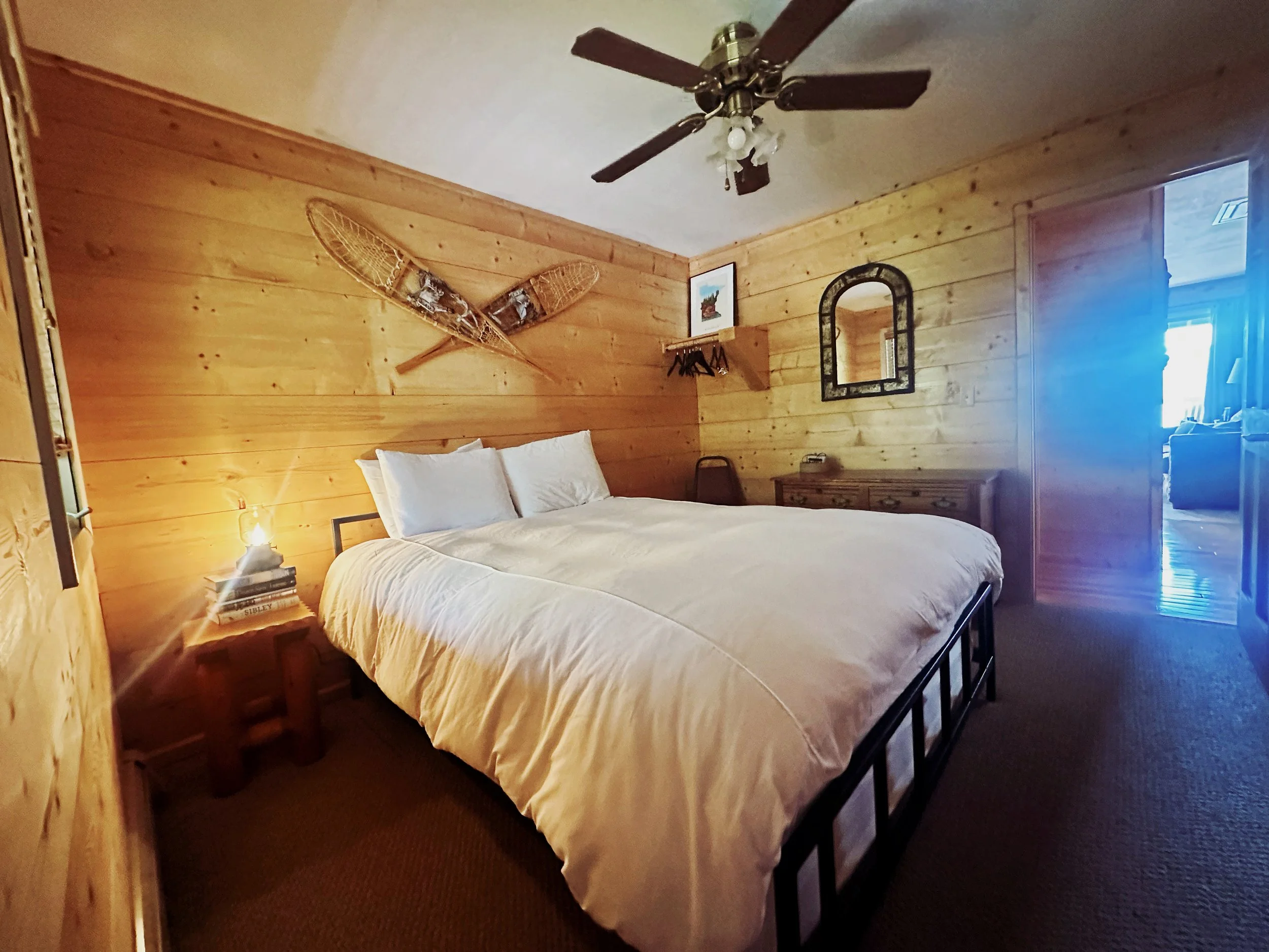 This two bedroom lodge room has a queen bed, two twin beds, a private bathroom, living area, and is the only lodge room with a full galley kitchen (oven/stove, full size fridge, microwave, drip coffee maker).