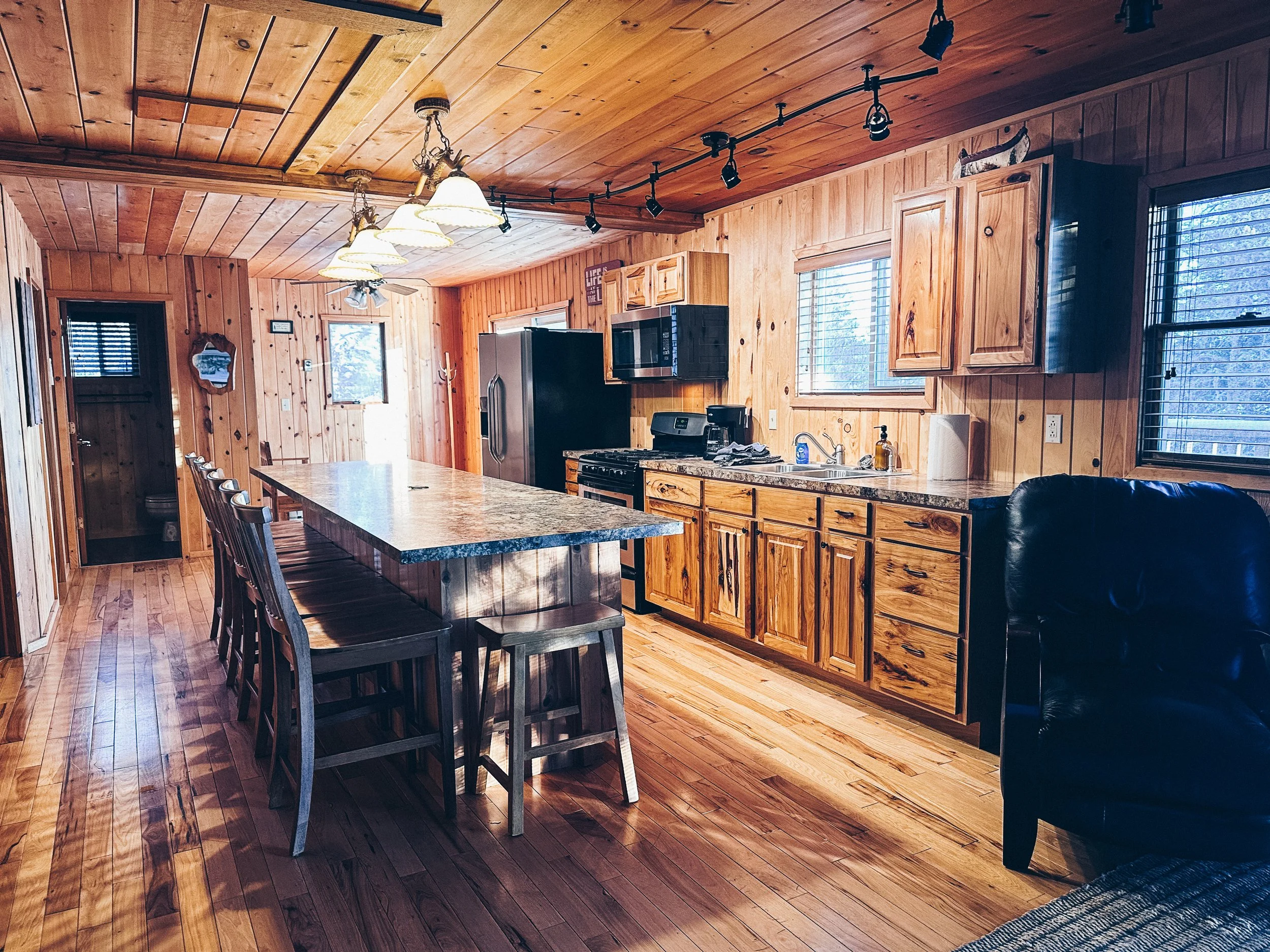 A cabin made for gathering with your favorite people. Enjoy family meals around the large kitchen island, or lay out on the stretch deck with propane grill and lake views. Wolf den has three bedrooms, with one queen bed, one king bed, and two twin beds, as well as one-and-a-half bathrooms and wood stove.